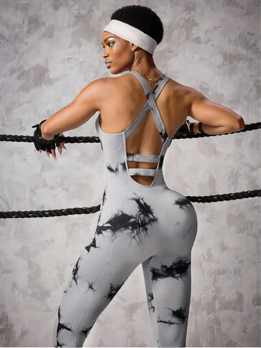 Back Crisscross Tie-Dye Scoop Neck Active Jumpsuit