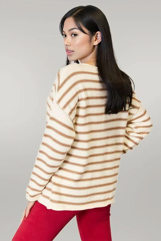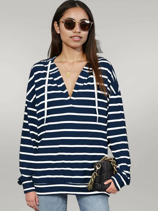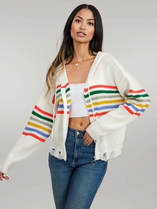Drawstring Striped Dropped Shoulder Hooded Cardigan