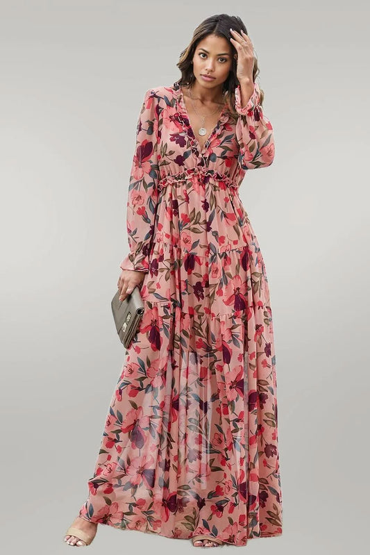 Floral Frill Trim Flounce Sleeve Plunge Maxi Dress