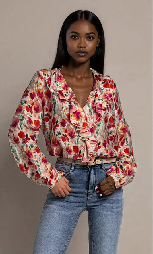 Floral Print Ruffle V-Neck Long Sleeve Blouse