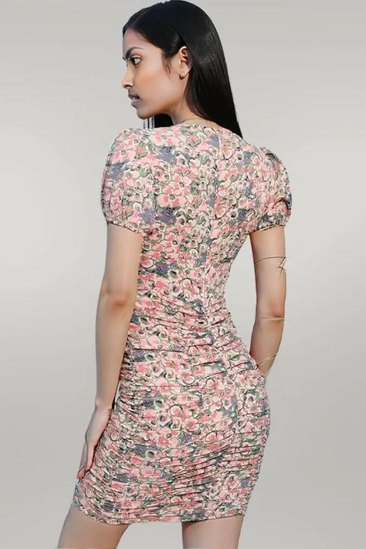 Floral Puff Sleeve Ruched Plunge Dress