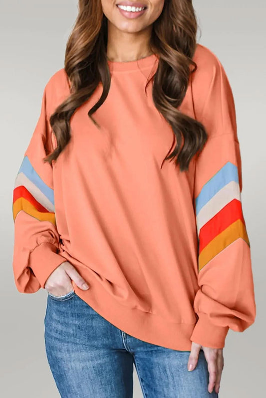 Flamingo Rainbow Striped Sleeve Crew Neck Loose Sweatshirt