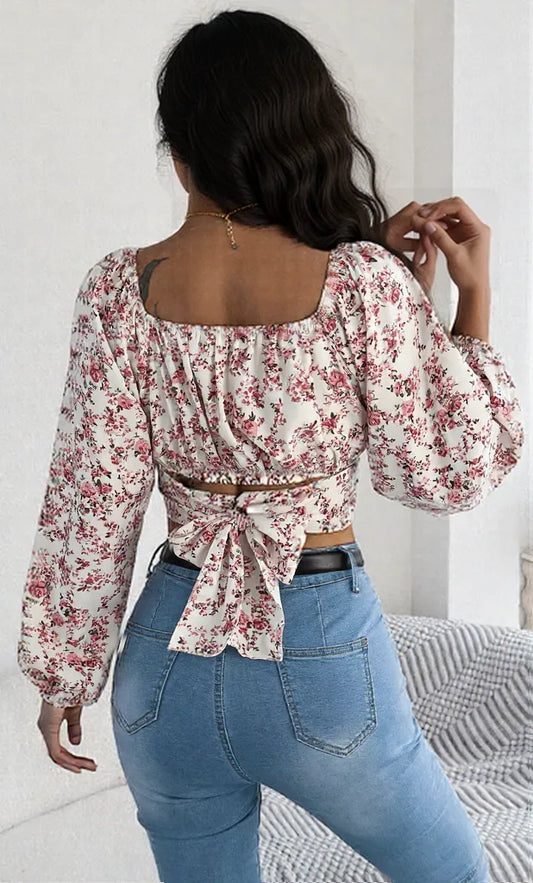 Floral Balloon Sleeve Square Neck Crop Blouse