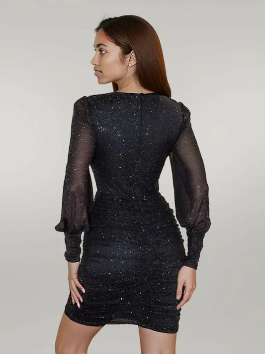 Glitter Cutout Twisted V-Neck Lantern Sleeve Mini Dress