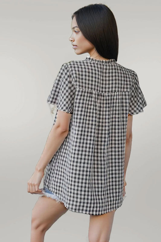 Gingham V Neck Plaid Loose Drawstring Blouse