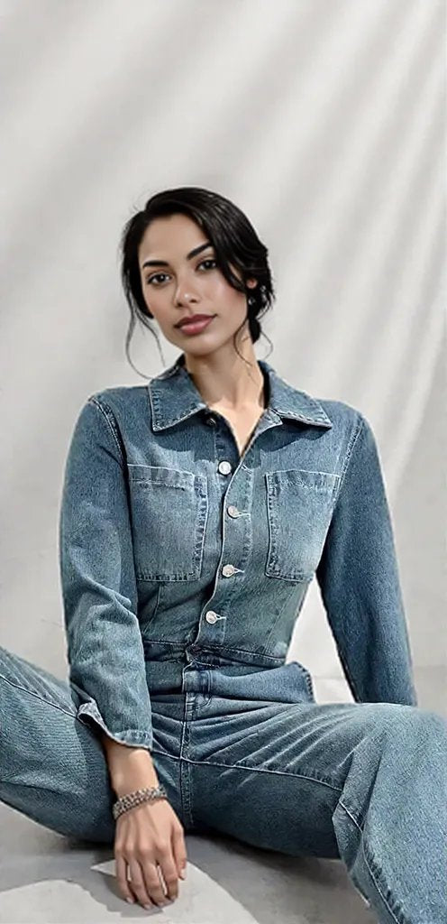 Half Button Long Sleeve Straight Leg Denim Jumpsuit