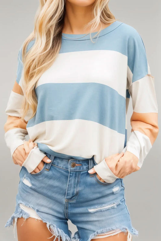 Light Blue Colorblock Striped Drop Shoulder Long Sleeve Top