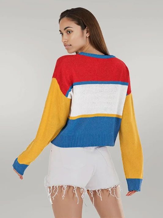 Perfee Contrast V-Neck Long Sleeve Knit Top