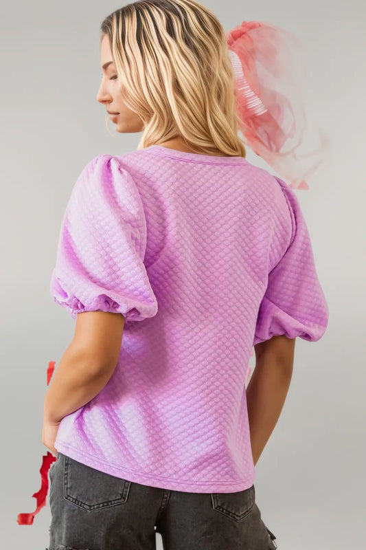 Phalaenopsis Solid Textured O Neck Puff Sleeve Blouse