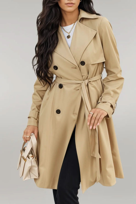 Pale Khaki Solid Color Lapel Collar Waist Tie Wind Coat