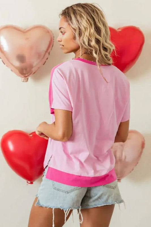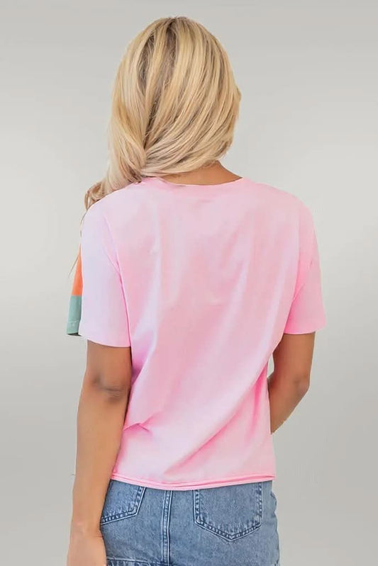 Pink Color Block Patchwork Seamed Crewneck T Shirt