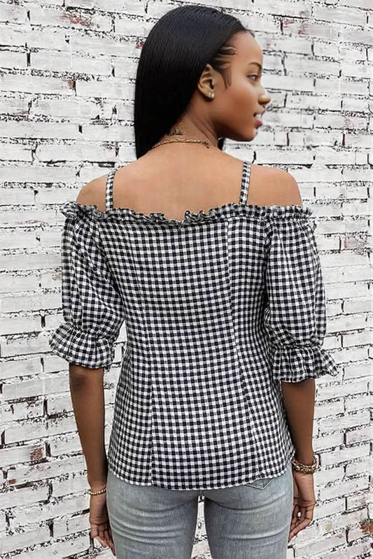 Plaid Buttoned Sweetheart Neck Cold-Shoulder Top
