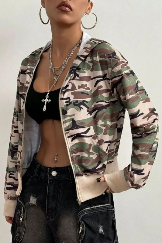 Pocketed Camouflage Zip Up Hooded Jacket