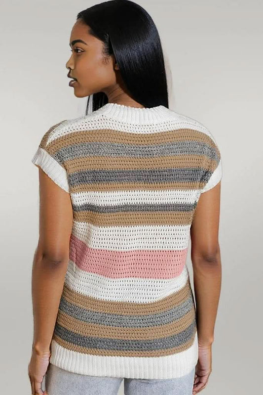 Pink Stripe Color Block Eyelet Knit Short Sleeve Sweater Tee