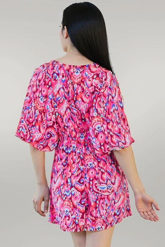 Pink Abstract Print Puff Sleeve V Neck High Waist Romper