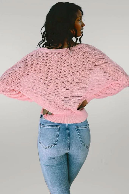 Pink Knitted Eyelets Round Neck Long Sleeve Top
