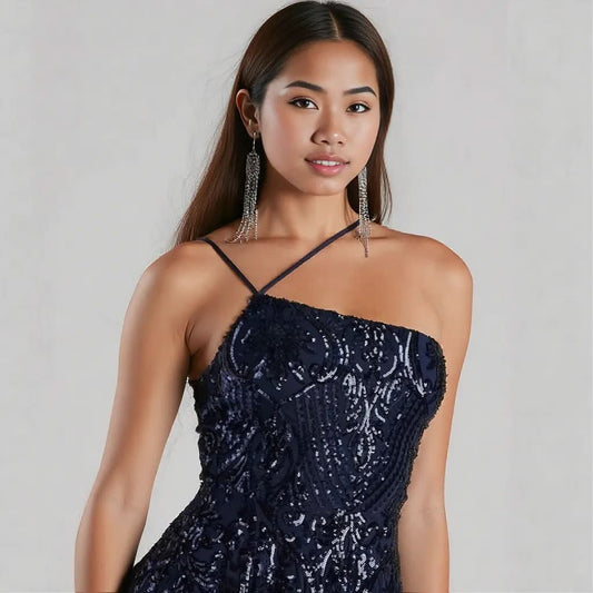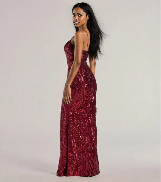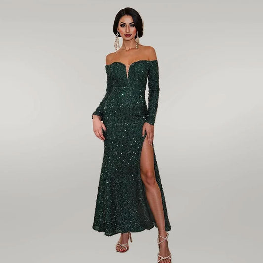 Sequined Solid Color High Waist off Neck Solid Color Cocktail Dress Evening Dress
