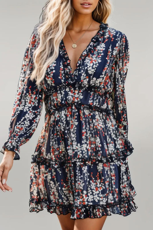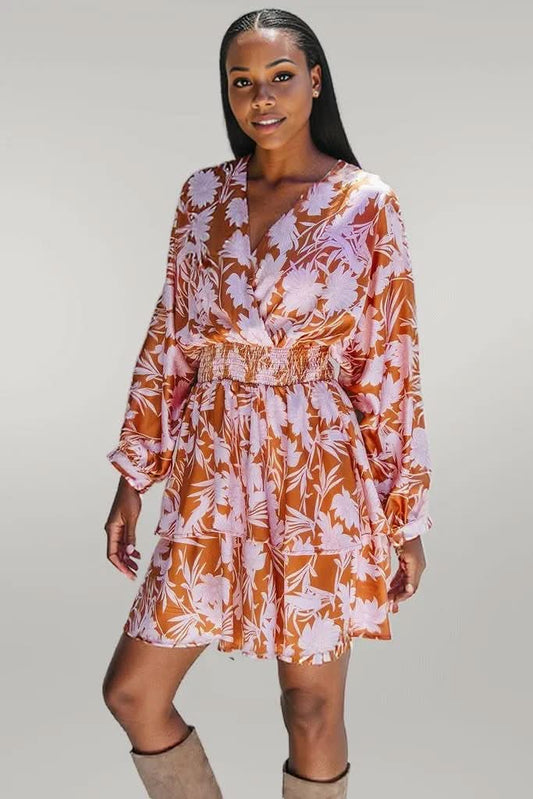 Brown Floral Puff Sleeve Smocked Waist Layered Dress