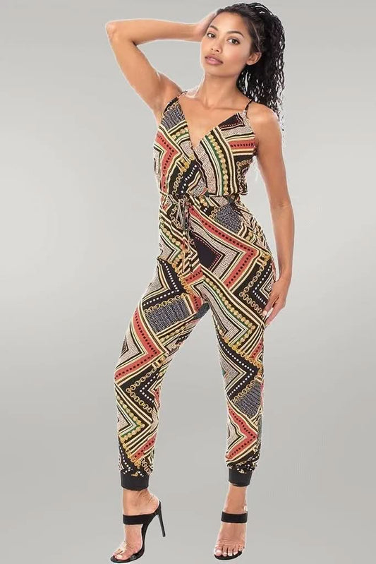Boarder Print Wrap Drawstring Waist Jumpsuit