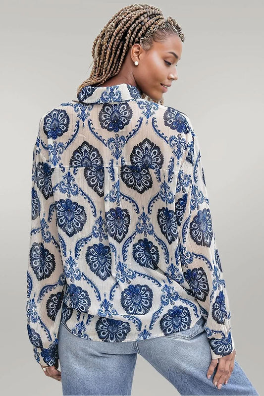 Blue Tribal Pattern Buttoned Front Loose Shirt