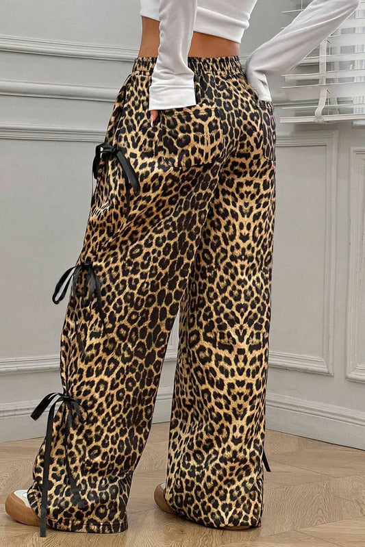 Brown Leopard Print Bow Tie Drawstring Elastic Waist Loose High Waist Pants