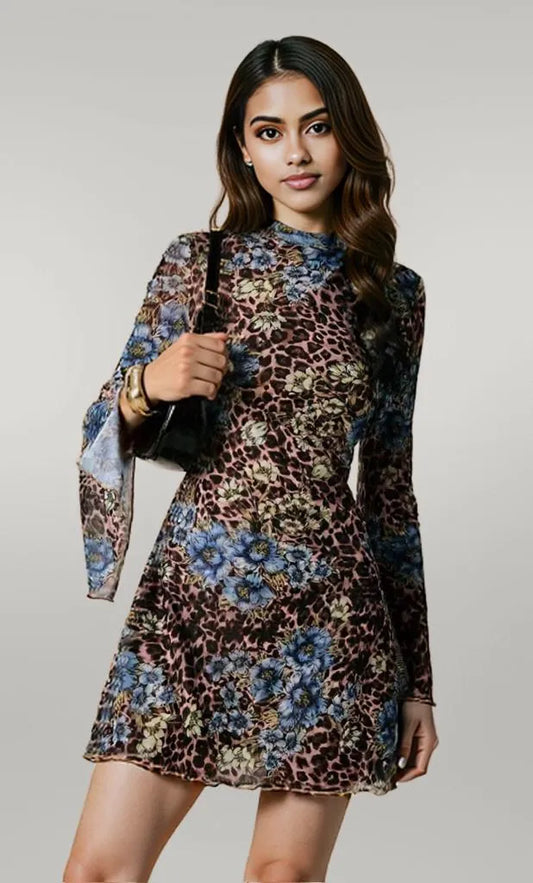 Floral Leopard Print Slit Sleeve Mini Dress