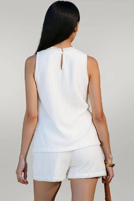 Beige Textured Knit Tank Top and Drawstring Shorts Set