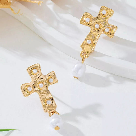 18K Gold-Plated Synthetic Pearl Cross Drop Earrings