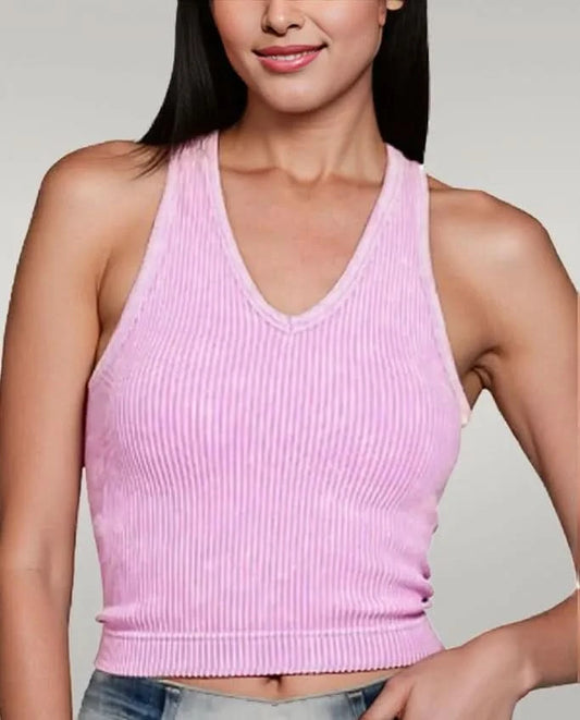 Zenana Washed Ribbed Seamless Bra Padded V-neck Tank Top