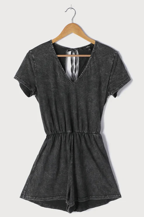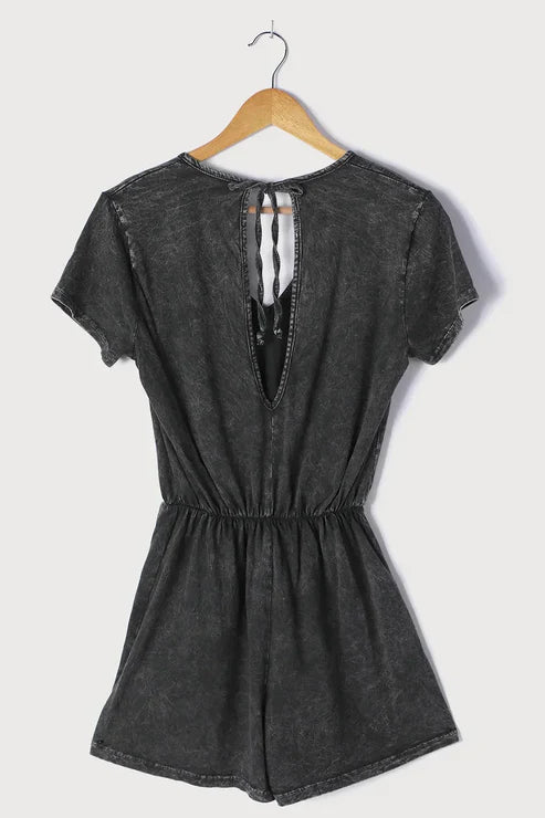 Introducing the Black Acid Wash Open Back Tie Detail Short Sleeve Romper