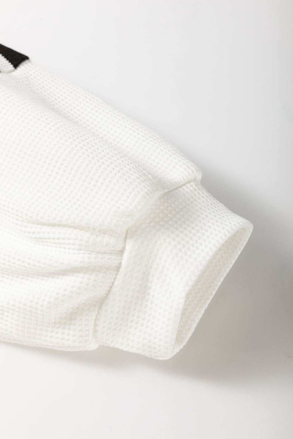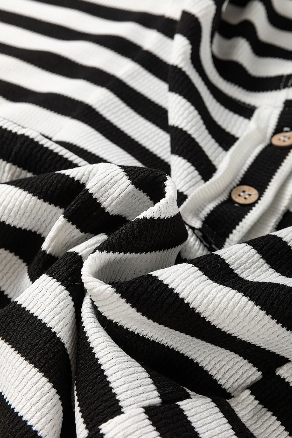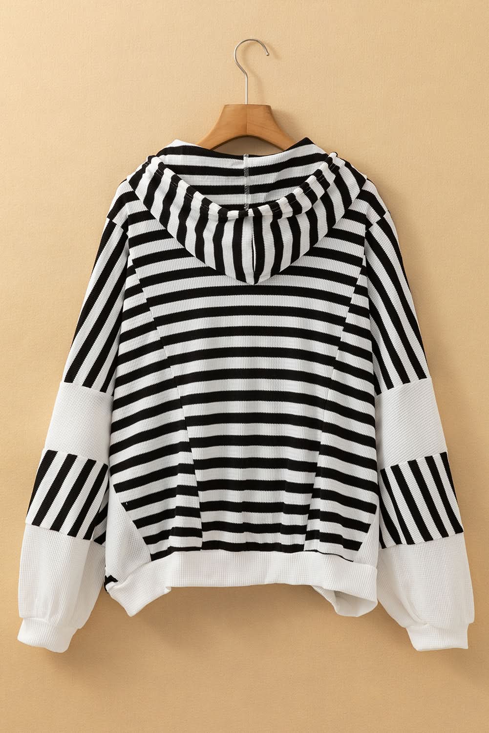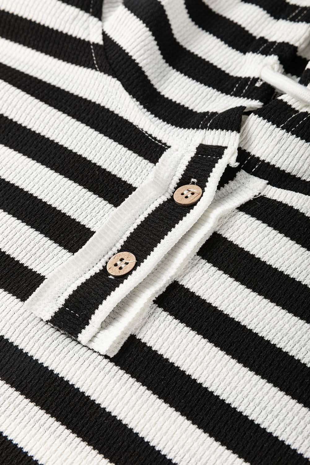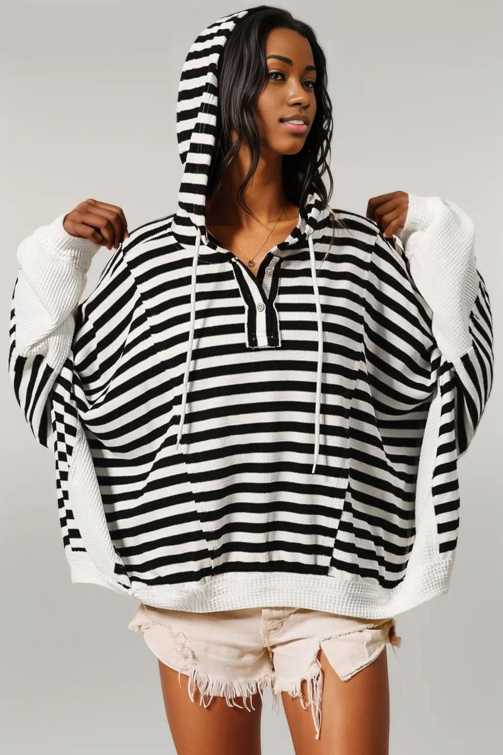 Black white Oversized Striped Henley Buttons Dolman Sleeve Hooded Top