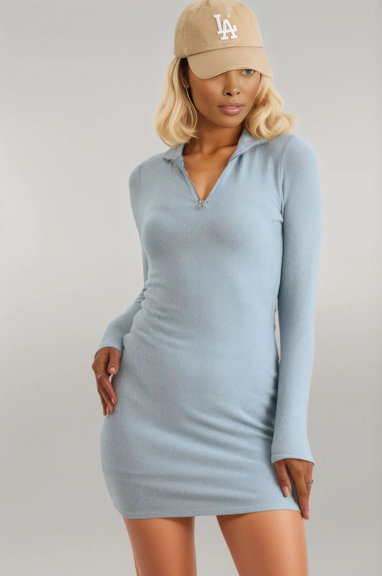 Blue Flannel Zip-up Mock Neck Mini Dress