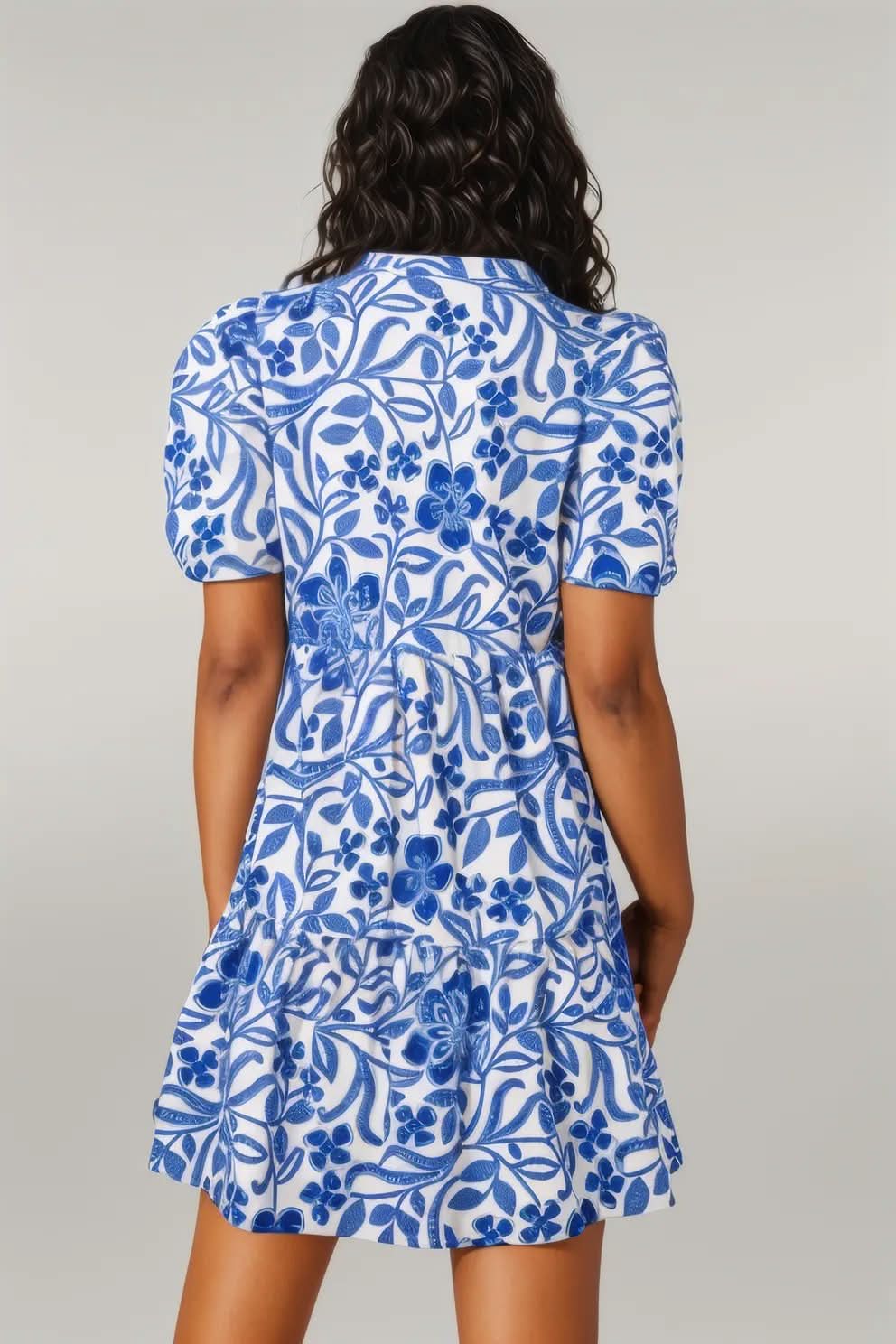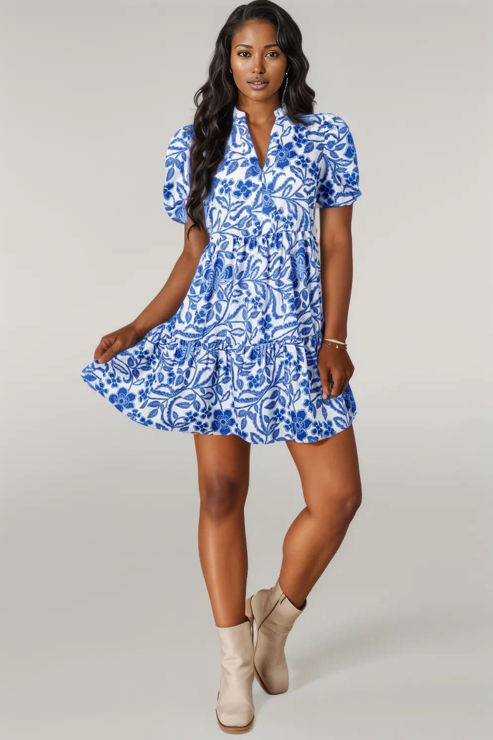This Blue Flower Print Puff Sleeve Tiered Dress is the epitome of feminine charm. The vibrant floral print, combined with the romantic puff sleeves and tiered design, creates a truly enchanting look.