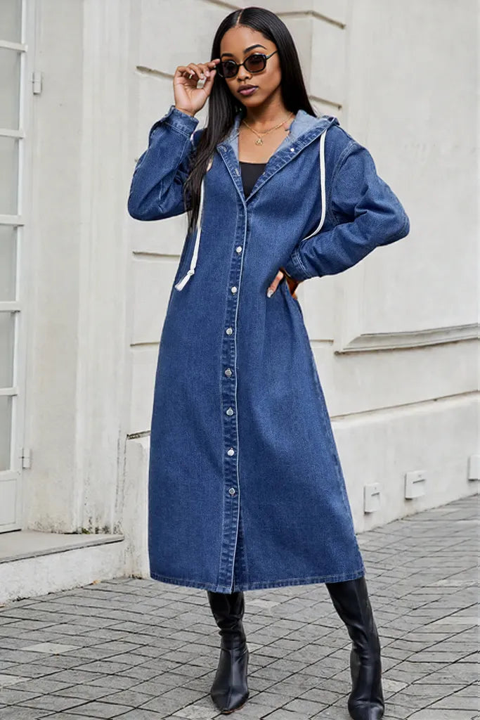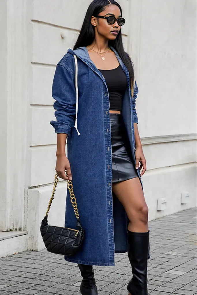 Experience the comfort and modern style of our Hooded Longline Denim-Look Outerwear. Shop now!