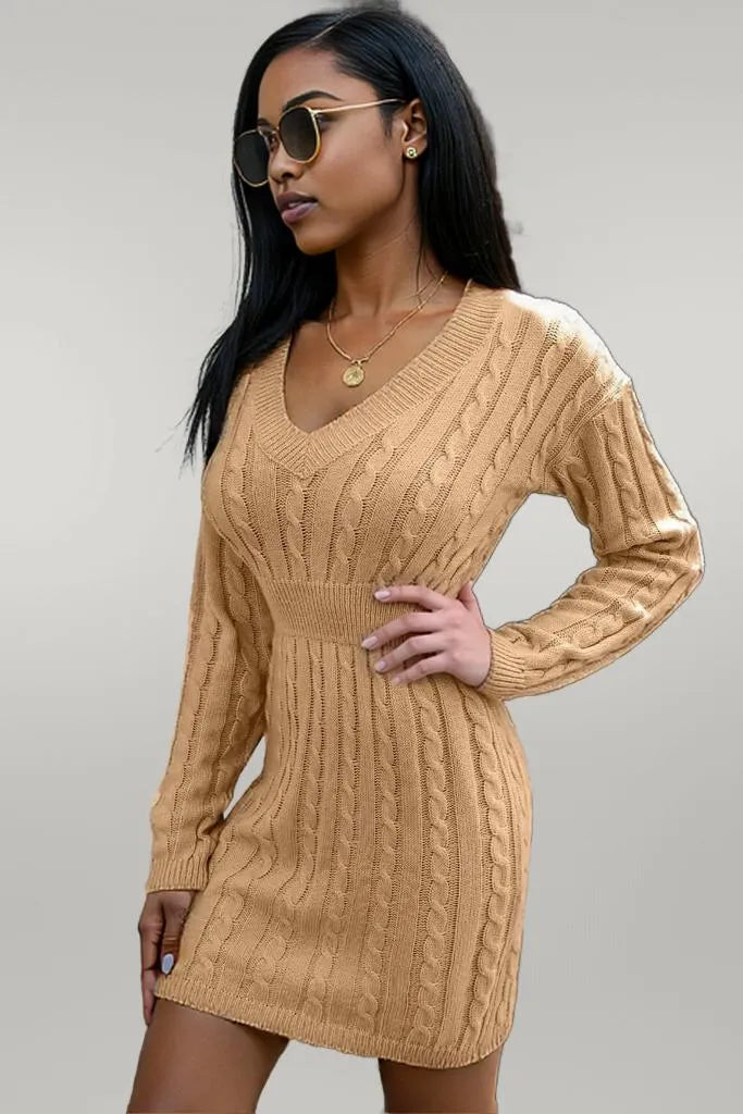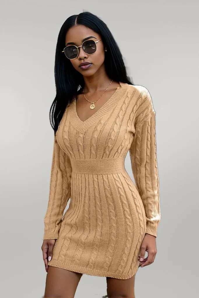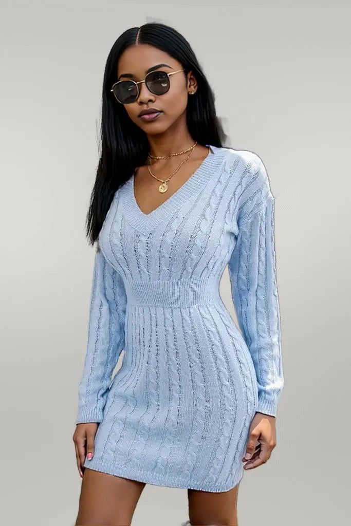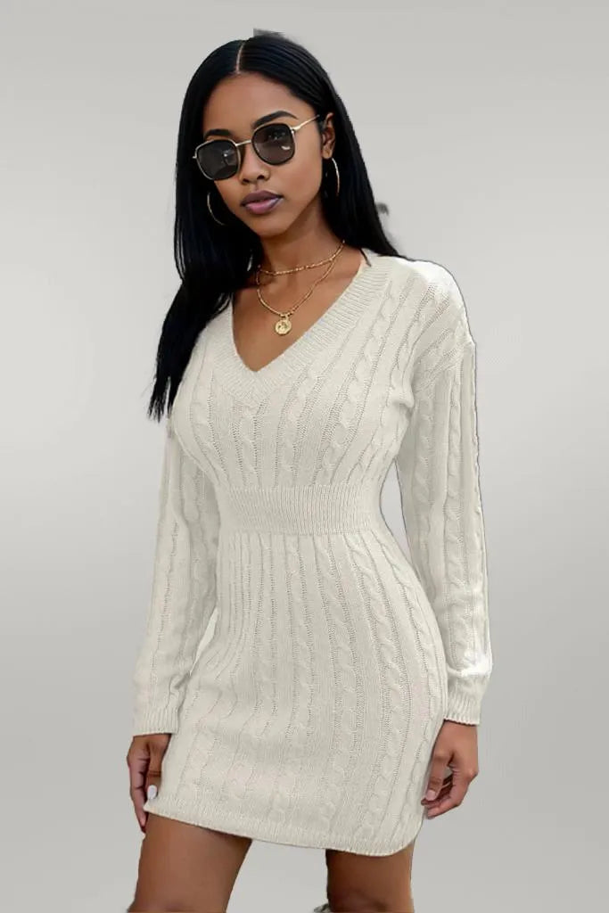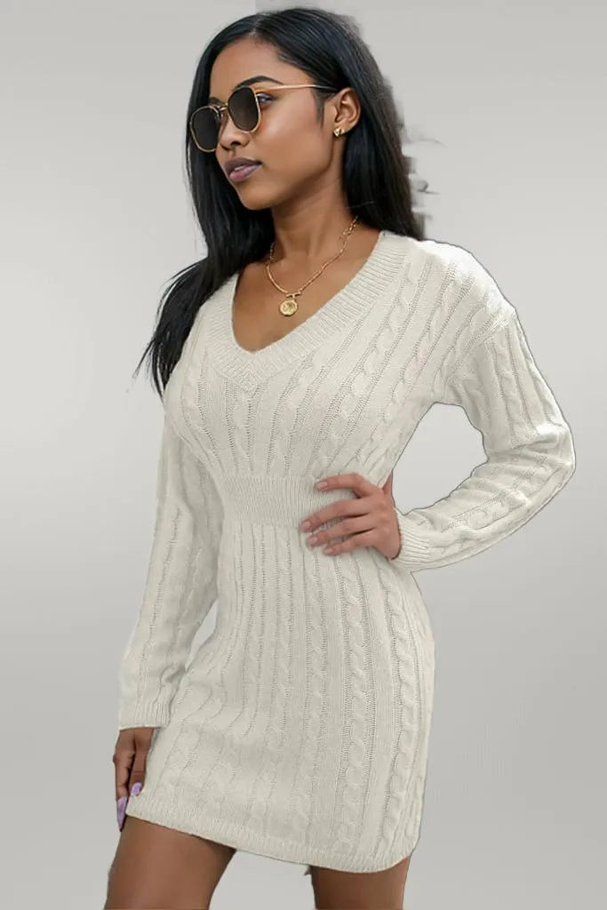 Cable-Knit V-Neck Long Sleeve Mini Sweater Dress