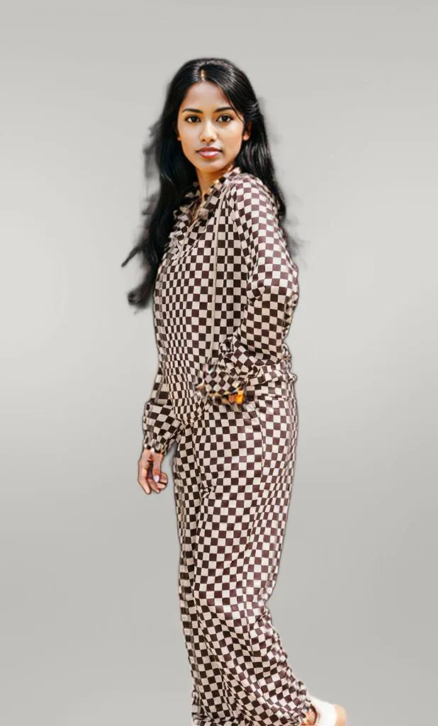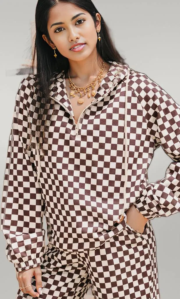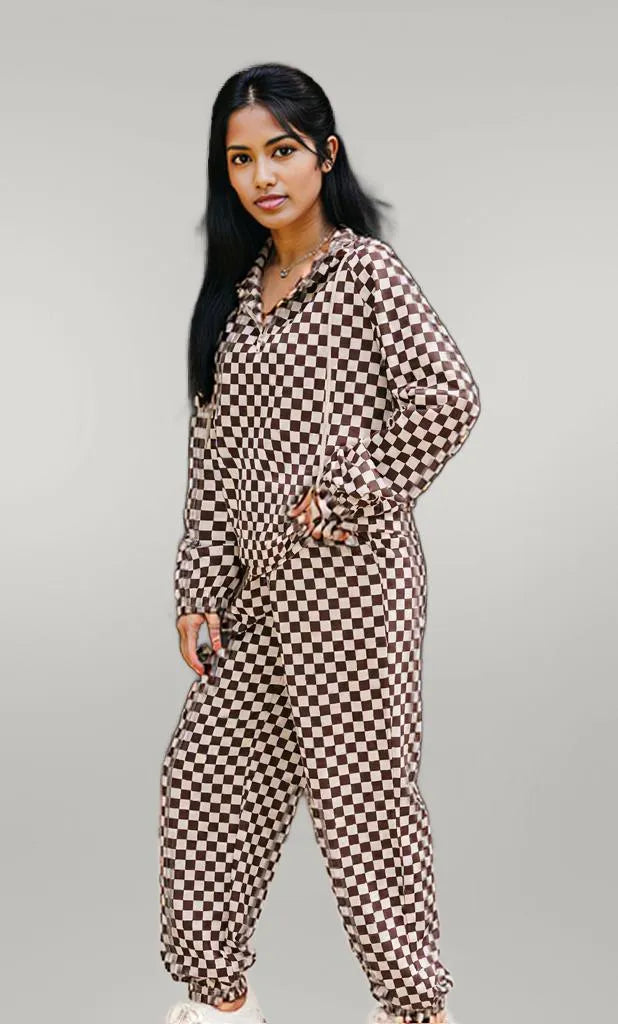 Experience the comfort and style of our Checkered Drawstring Hoodie and Pants Set. Shop now!