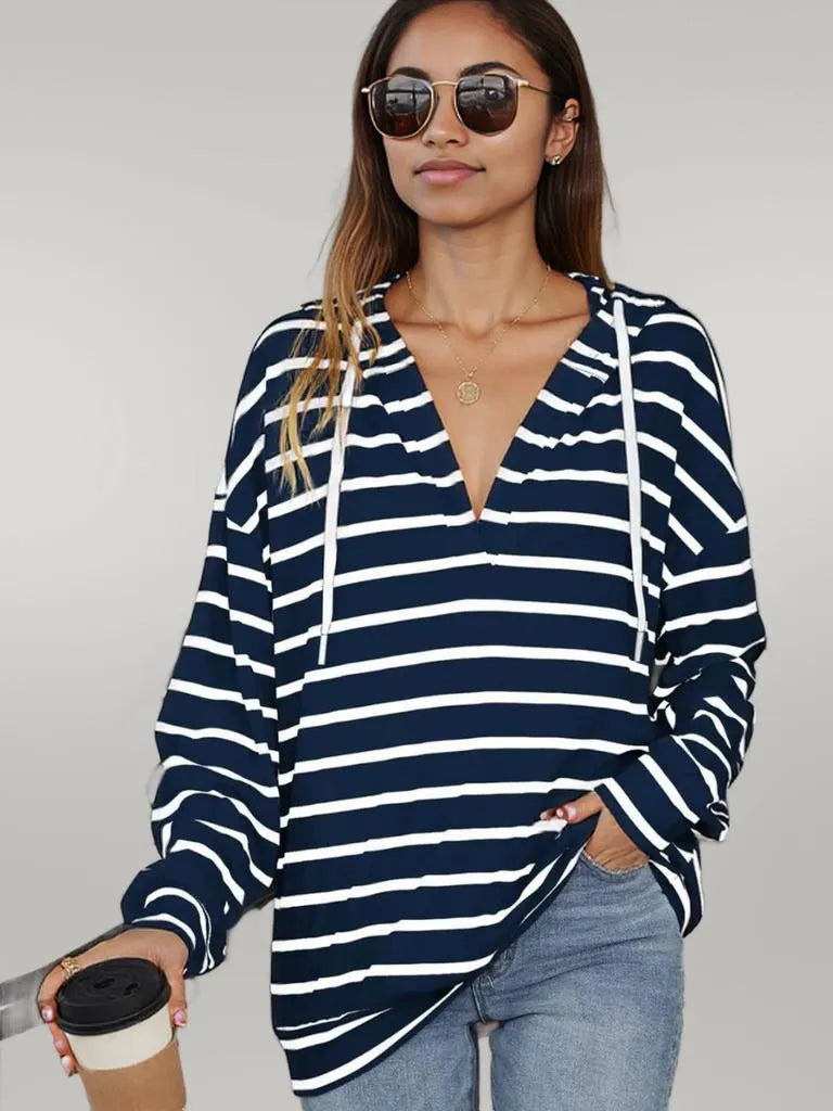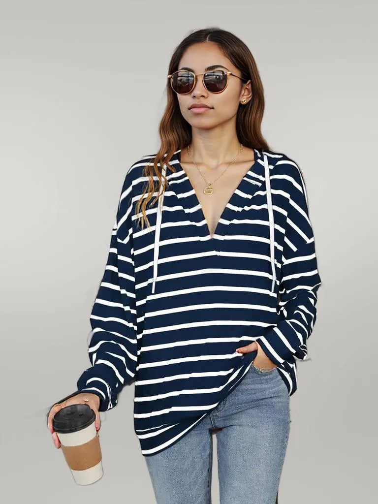 Experience the comfort and style of our Drawstring Striped Long Sleeve Hoodie. Shop now!
