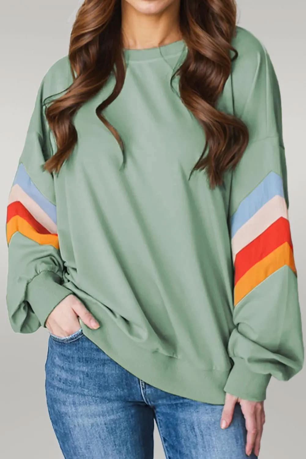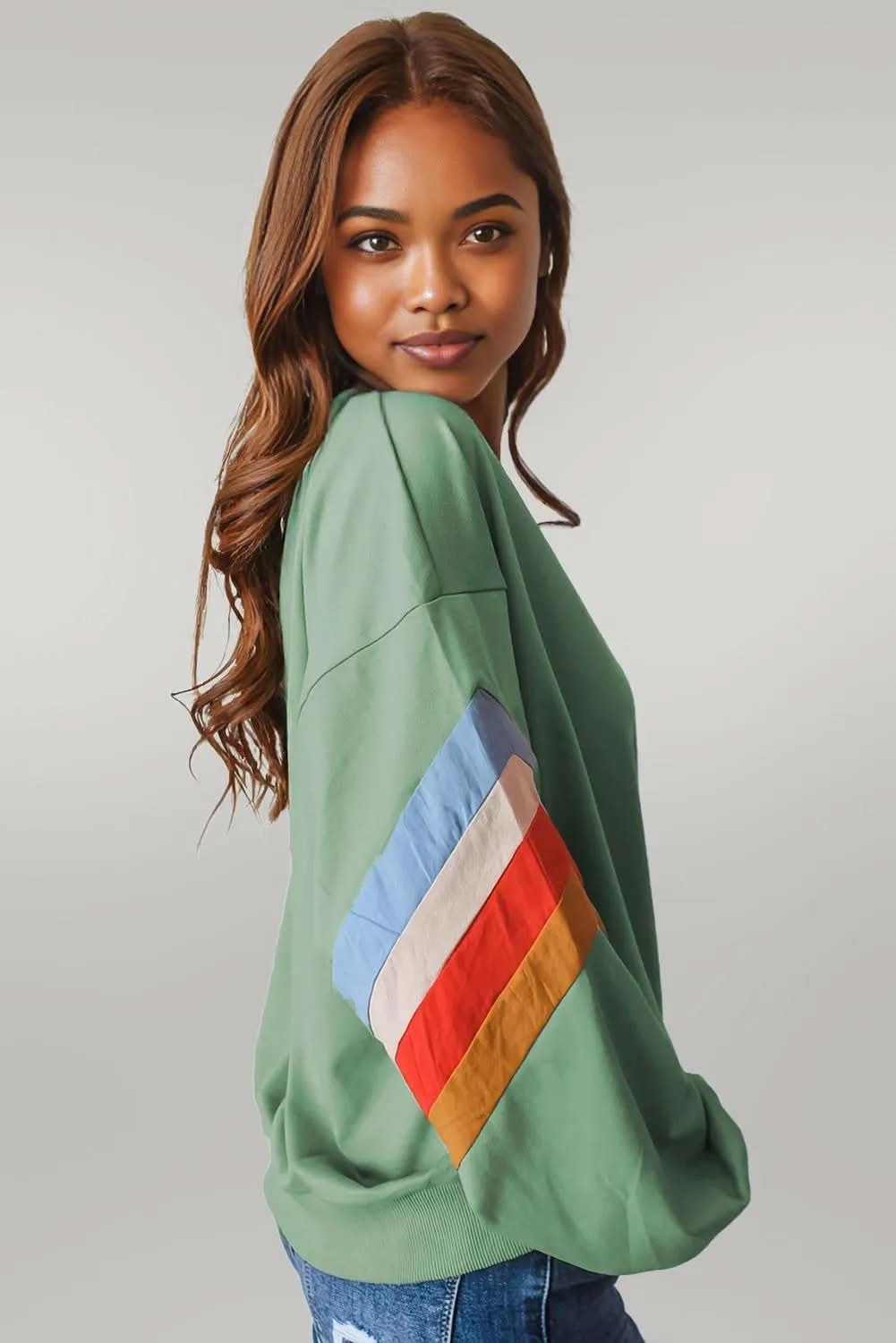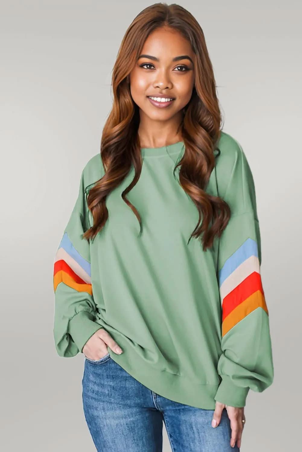 Flamingo Rainbow Striped Sleeve Crew Neck Loose Sweatshirt: Embrace Vibrant Style