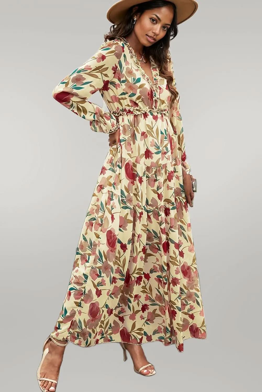 Embrace Your Inner Boho Goddess with Our Floral Frill Trim Flounce Sleeve Plunge Maxi Dress