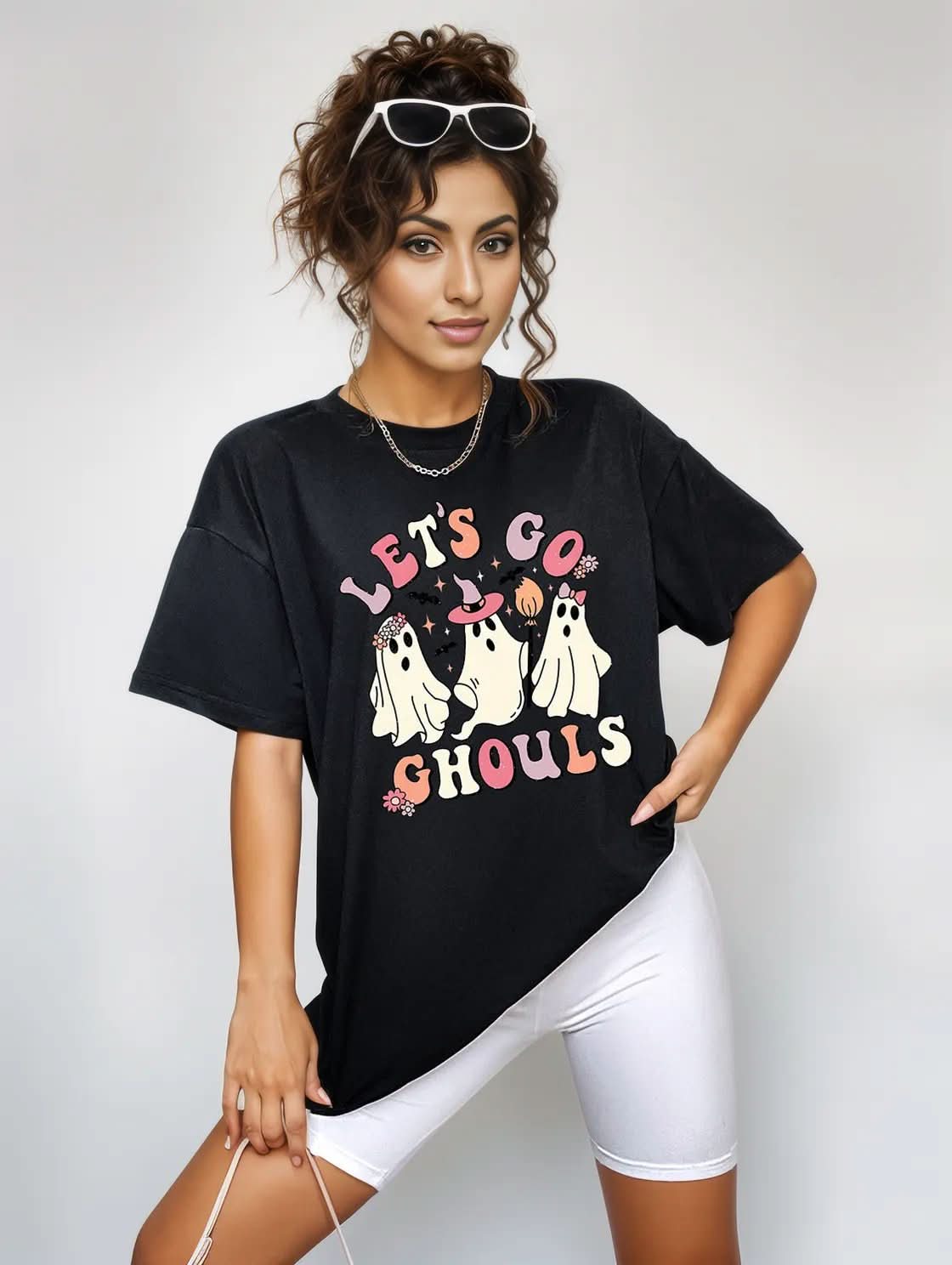 Experience the fun and style of our LET'S GO GHOULS Graphic T-Shirt. Shop now!