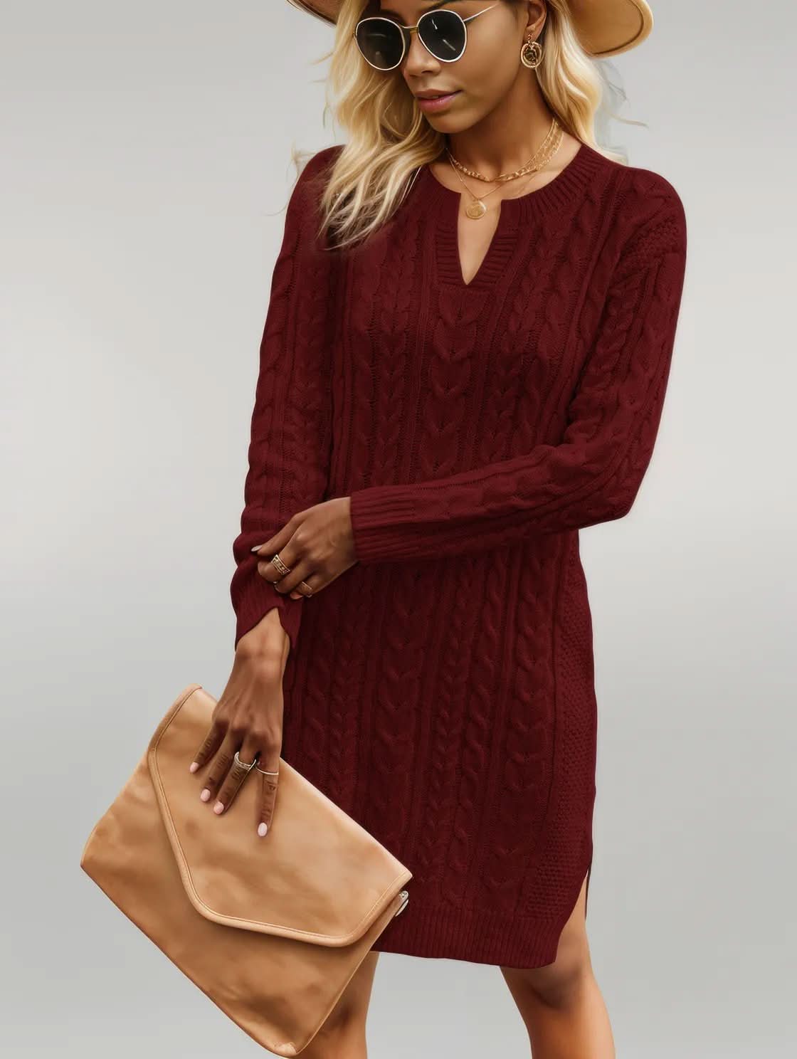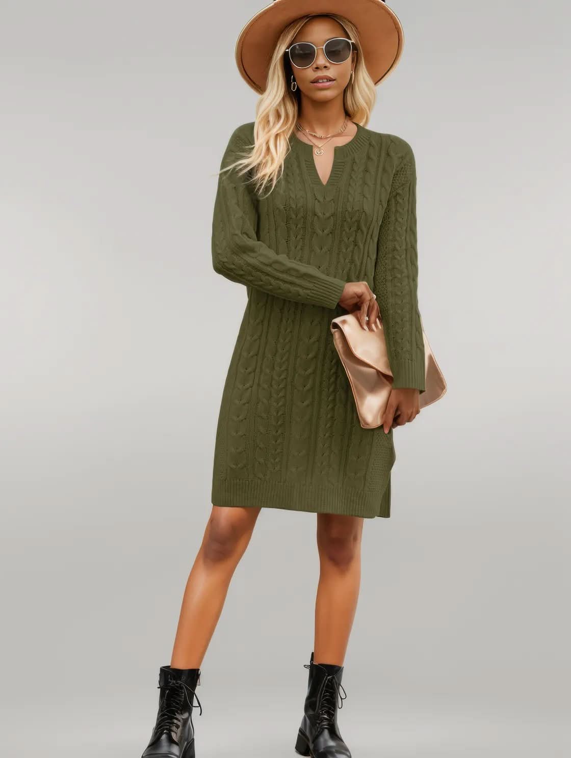 Wrap yourself in warmth and style with our Notched Neck Cable-Knit Slit Sweater Dress. This cozy and chic dress is perfect for chilly days and cozy nights in.