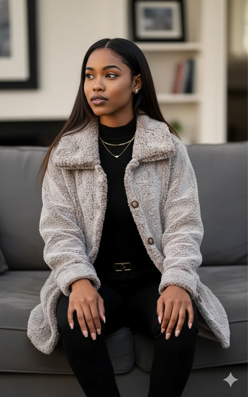 Pocketed Collared Neck Long Sleeve Plush Jacket