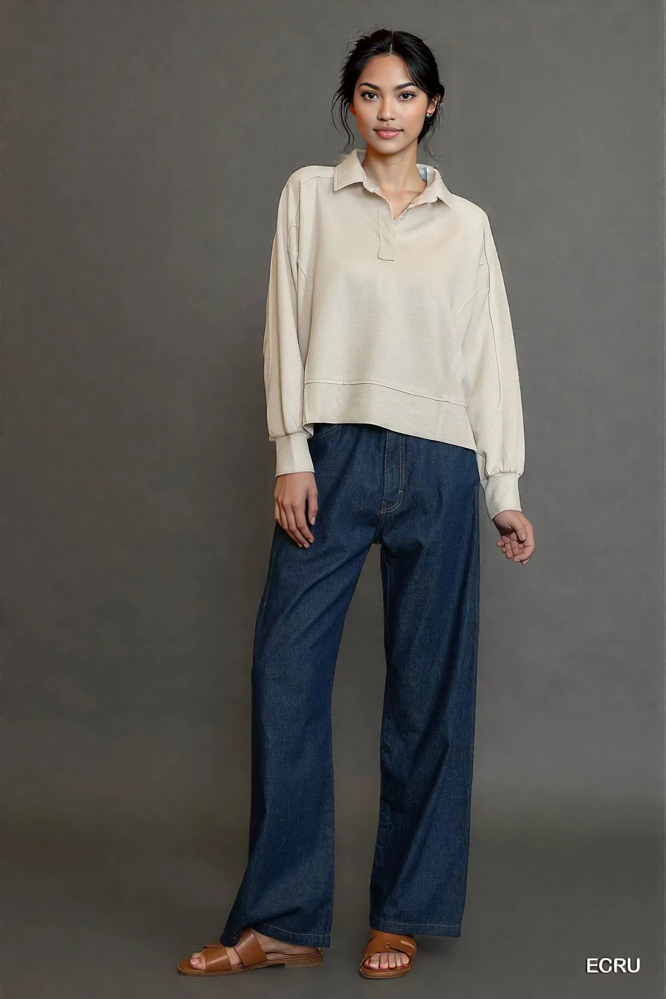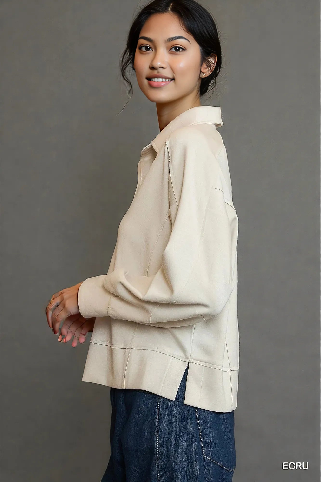 Experience the comfort and style of our Collared Neck Long Sleeve Top with Raw Hem Detail. Shop now!