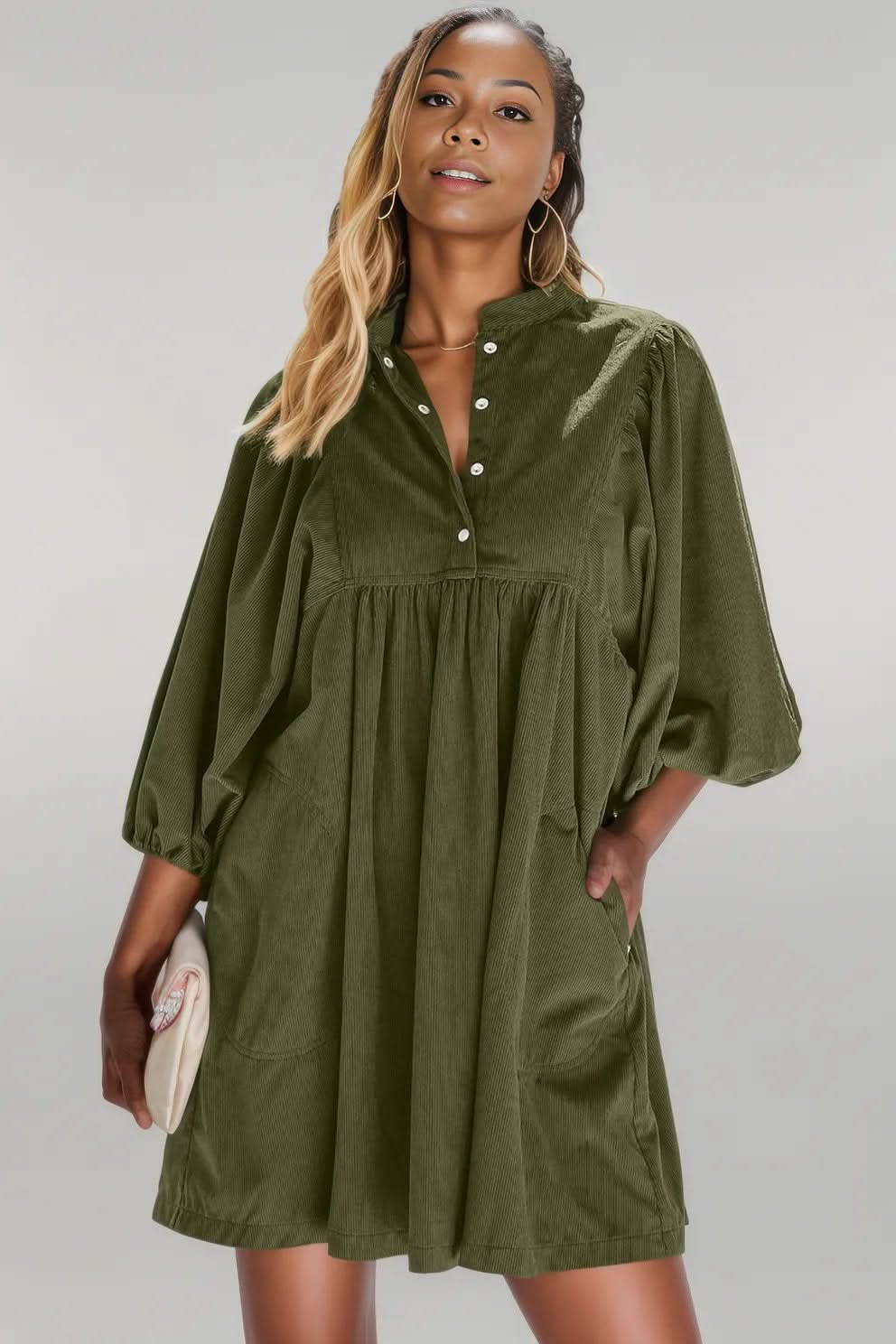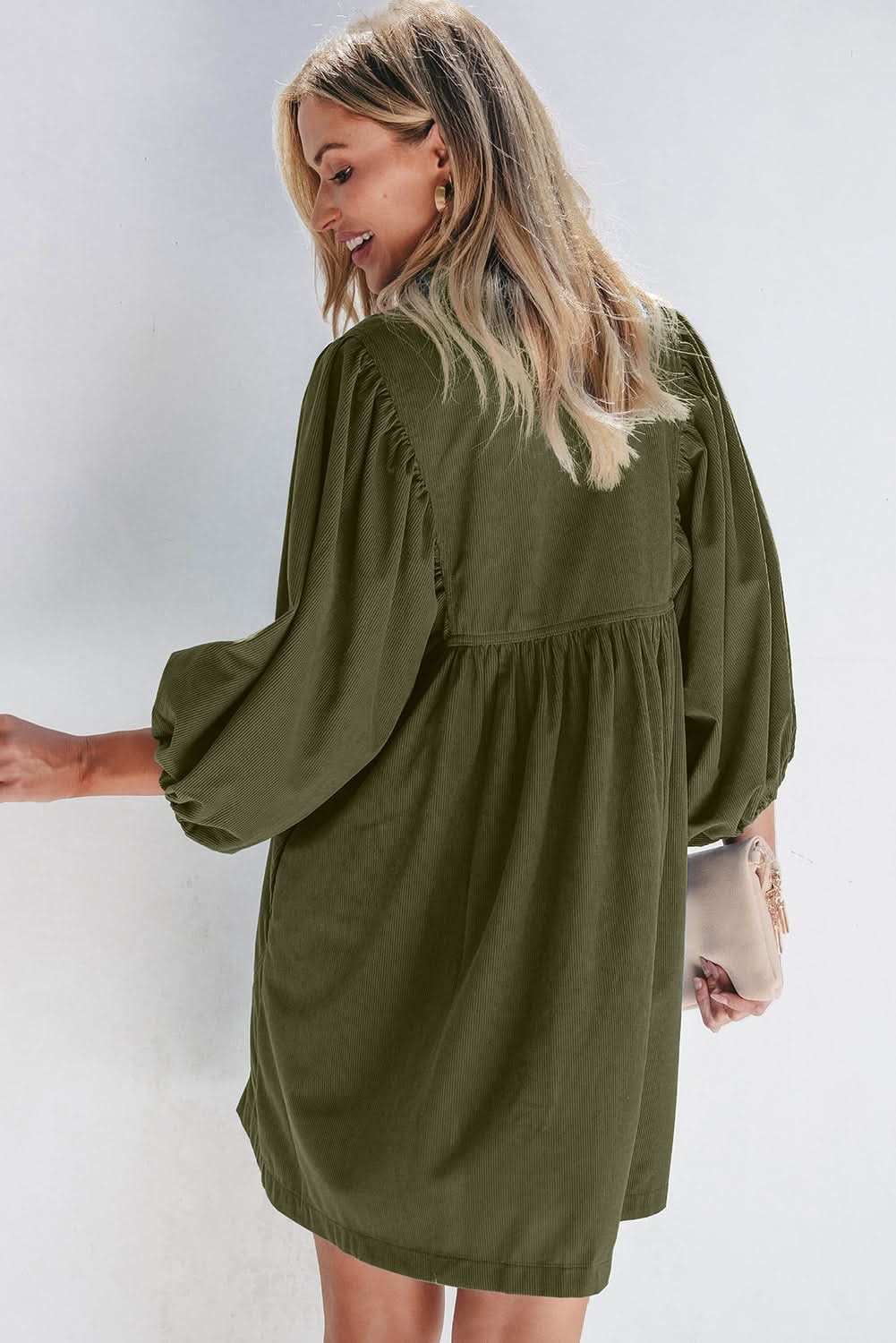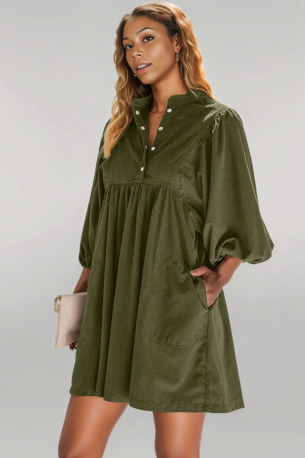 Vineyard Green Corduroy Snap Buttons Empire Waist Bracelet Sleeve Dress