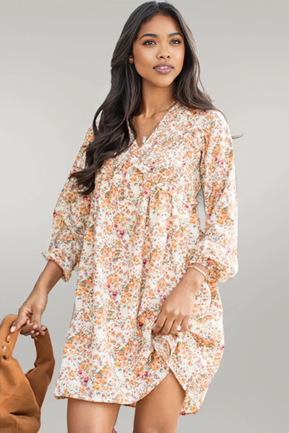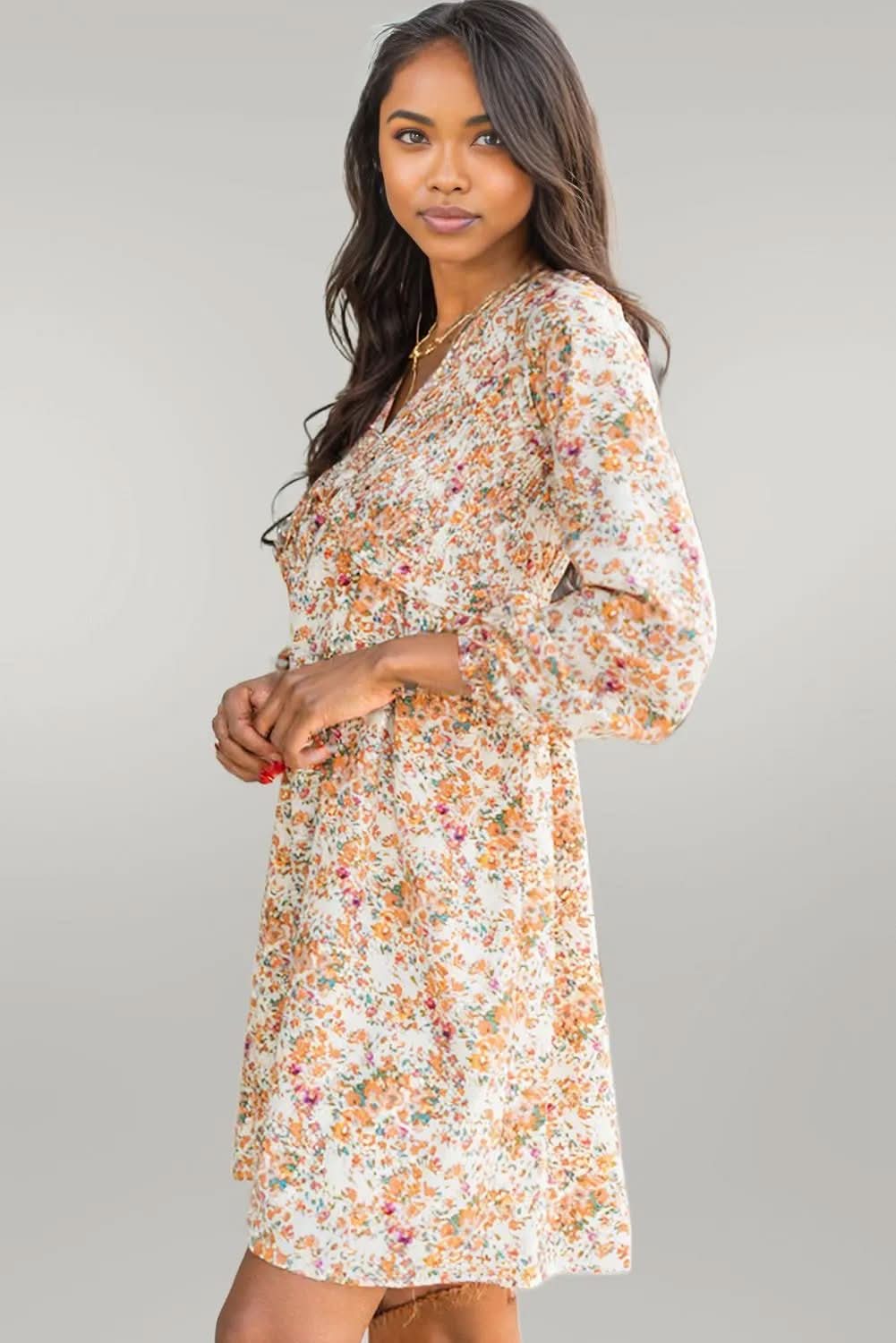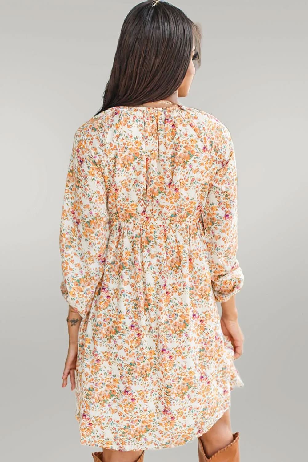 Yellow Boho Floral V Neck Ruffled Empire Waist Long Sleeve Mini Dress